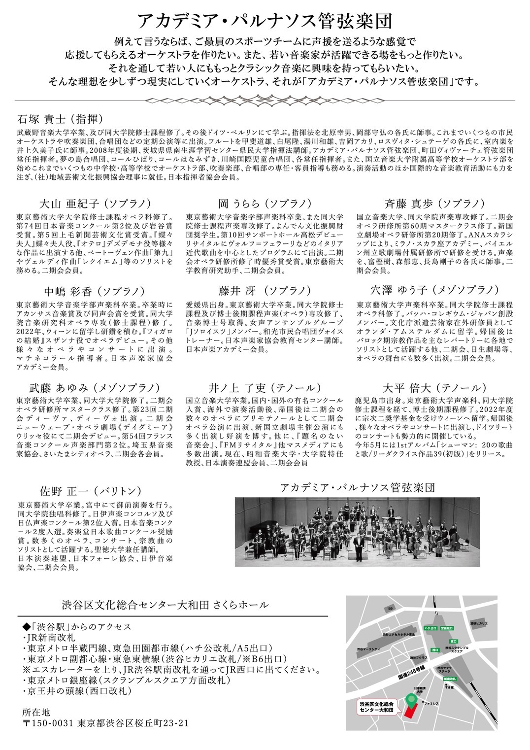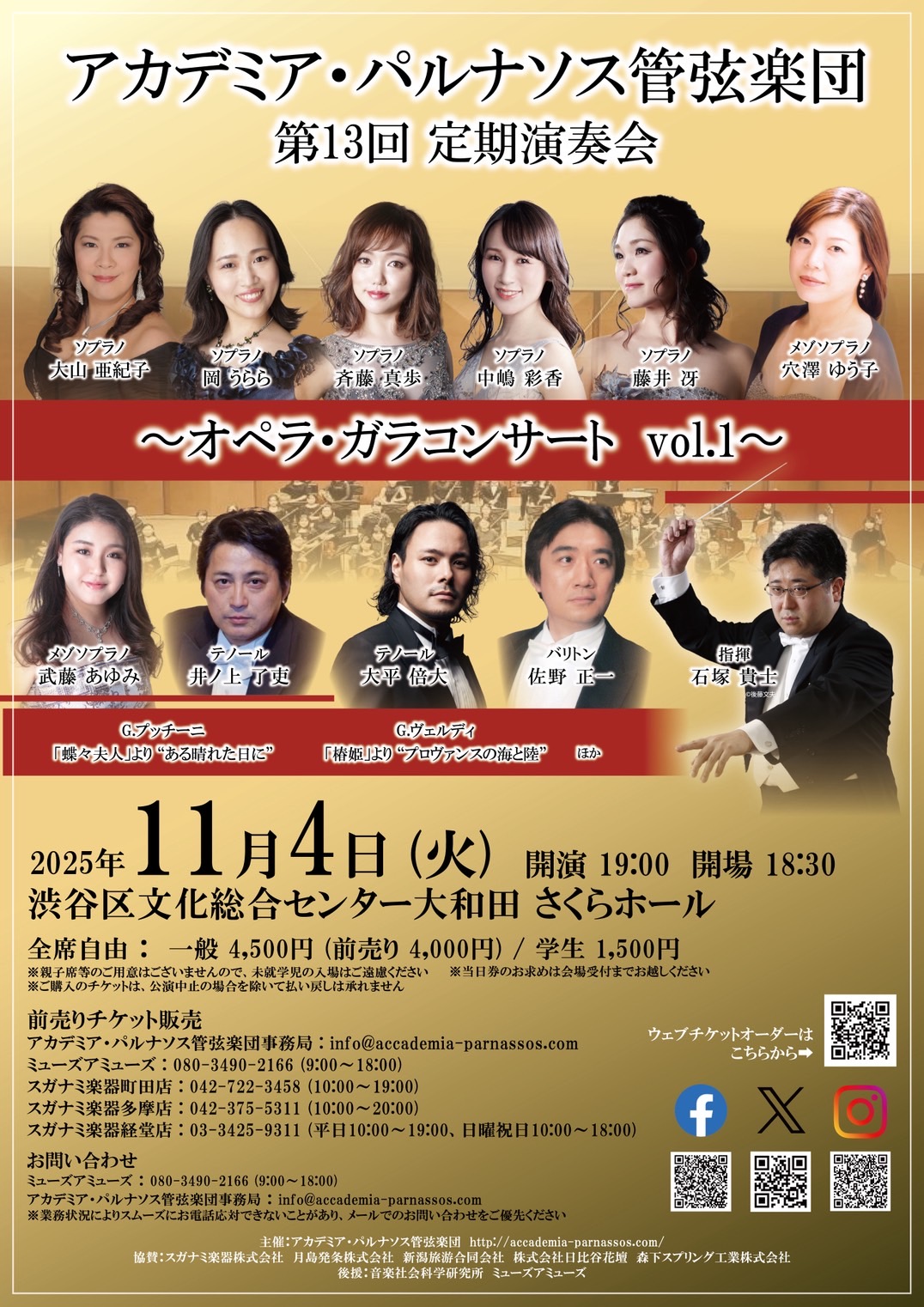 コンサート情報 『アカデミア・パルナソス管弦楽団』 第13回 定期演奏会 ~オペラ・ガラコンサート~ 2025年11月4日(火) 開場18:30 開演19:00 渋谷区文化総合センター 大和田 さくらホール 一般 ¥4,500