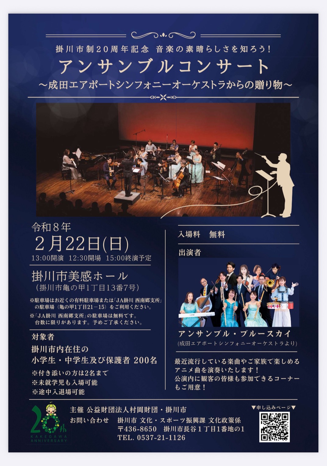 コンサート情報 『掛川市制20周年記念 アンサンブルコンサート』 ~成田エアポートシンフォニーオーケストラからの贈り物~ 2026年2月22日(日) 開場12:30 開演13:00 掛川市美感ホール 一般 無料